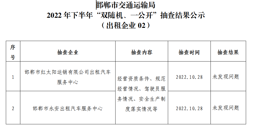 邯郸市交通运输局2022年下半年“双随机、一公开”抽查结果公示(出租企业02)