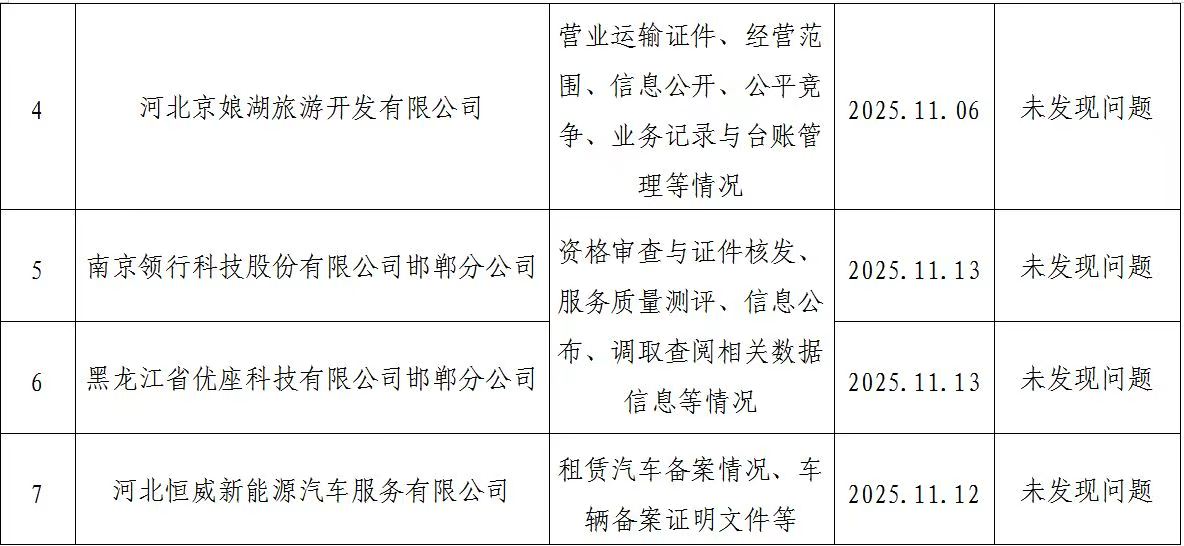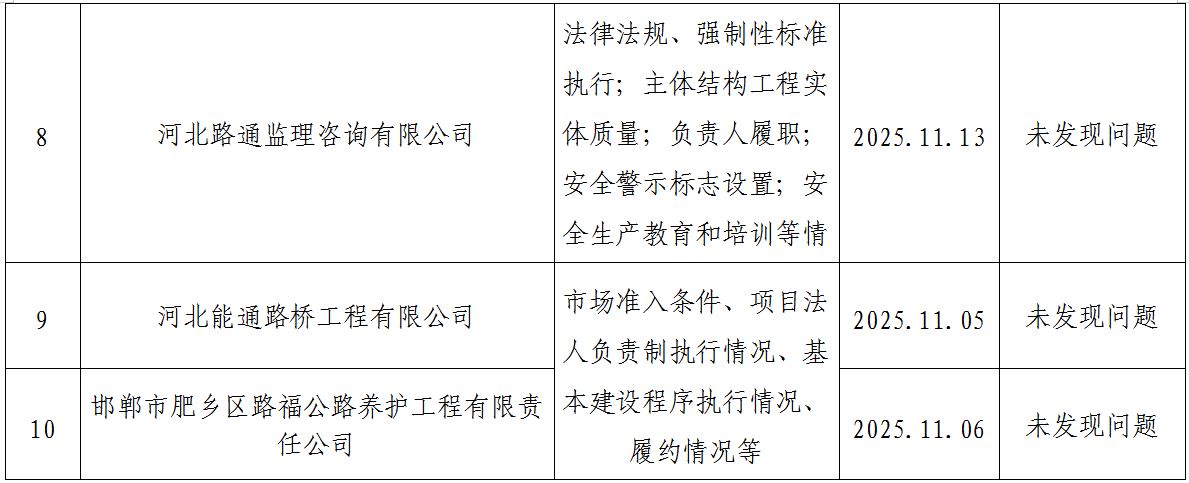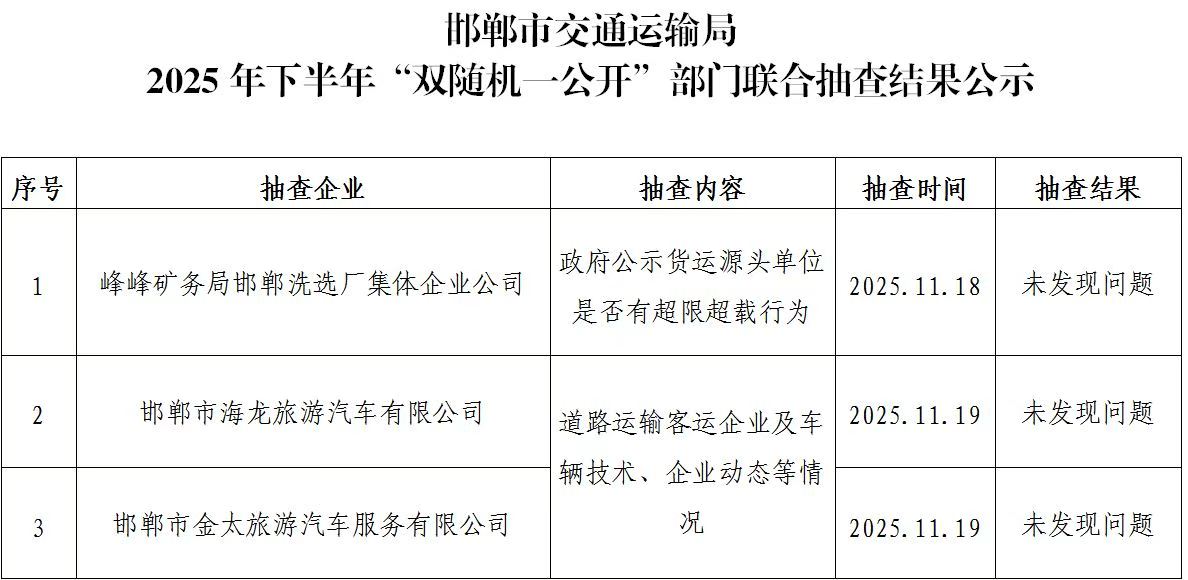 邯郸市交通运输局 2025年下半年“双随机一公开”部门联合抽查结果公示